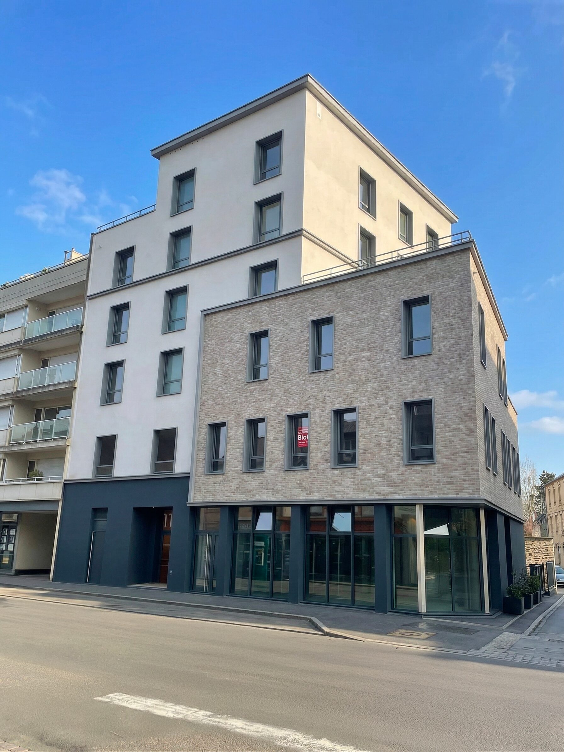 En rez-de-chaussée, une cellule commerciale accueil une agence Blot Immobilier.